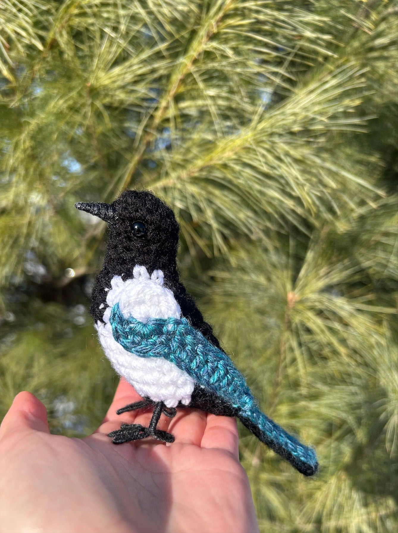 Each bird is carefully crocheted with cozy, high-quality yarn, and finished with sculpted wire feet and a beak that add lifelike character. Measuring at about 3.5” tall and 5.5” long (regular size) or 5.5" tall and 7.5" long (larger size)— they are the perfect size to perch on a shelf, nestle among your plants, or keep you company at your desk. Whether you’re gifting it to a fellow bird lover or adding it to your own flock, this little magpie is sure to make you smile.